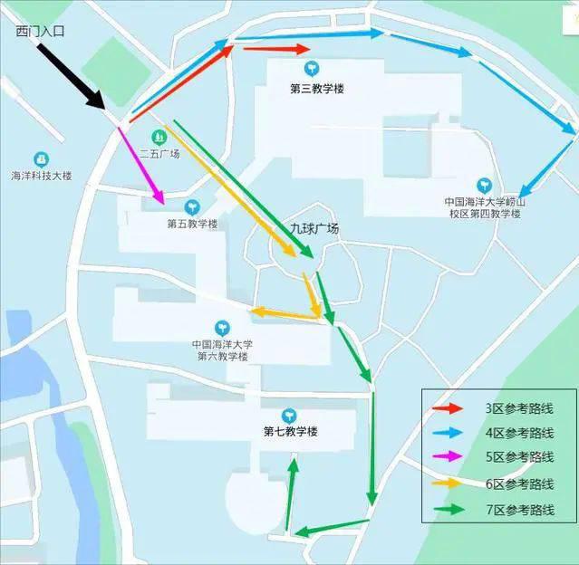 本次考试考场全部设在中国海洋大学崂山校区,考场分布在教学楼第3、4、5、6、7教学区,具体考场对应教室请见附件。 1. 请考生及时登录中国研招网报名系统查看是否有站内消息,并按照站内消息要求完成相应操作。2. 首场考试请务必携带考前48小时内核酸检测阴性纸质报告(核酸检测出结果的时间应在12月23日早8:00后)和《健康管理信息采集表》。按照《关于上传核酸检测报告的通知(3752考点)》要求,按时上传核酸检测报告电子版。3. 顺丰速运公司在各考区门口为考生提供物品寄存服务,考生务必提前到达考点,抓紧时间进行物品寄存后排队接受安检。4. 请及时关注中国海洋大学研究生招生信息网发布的后续通知。考区示意图如下: