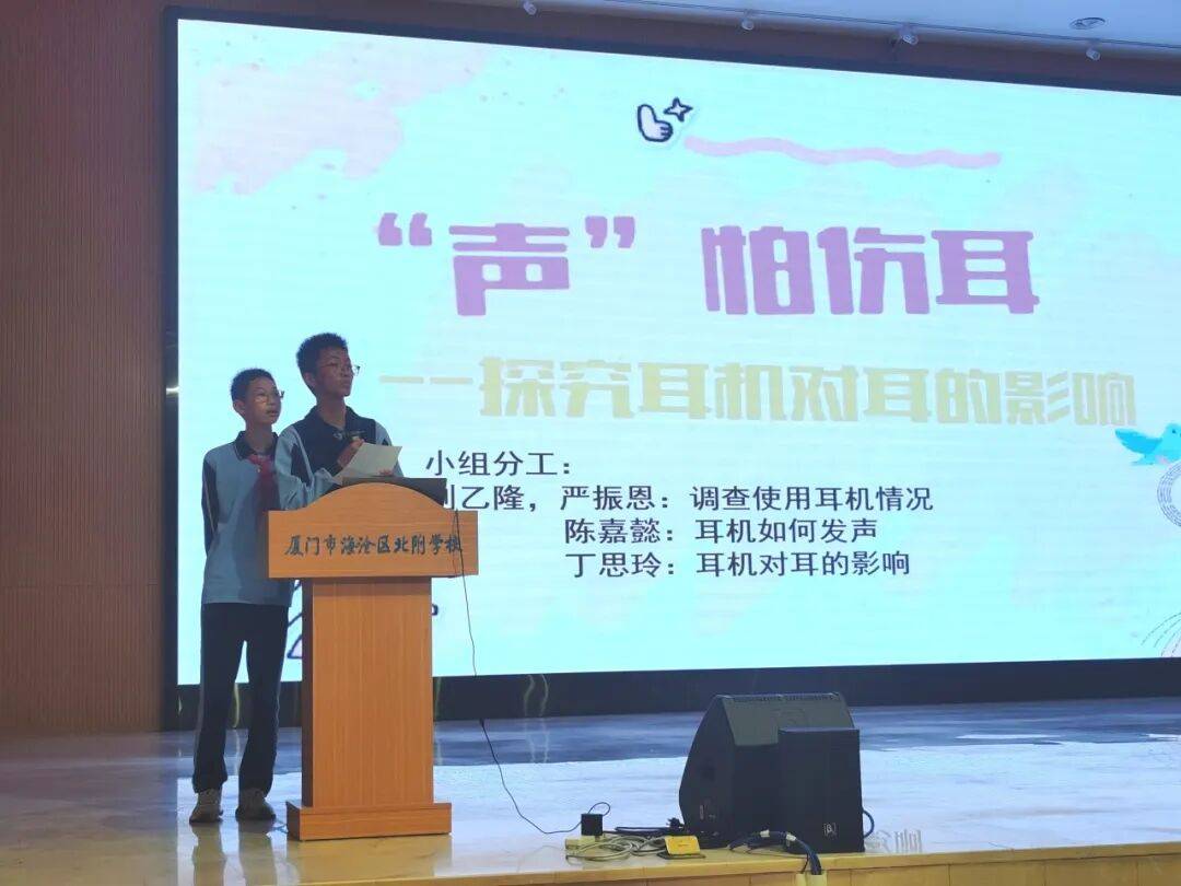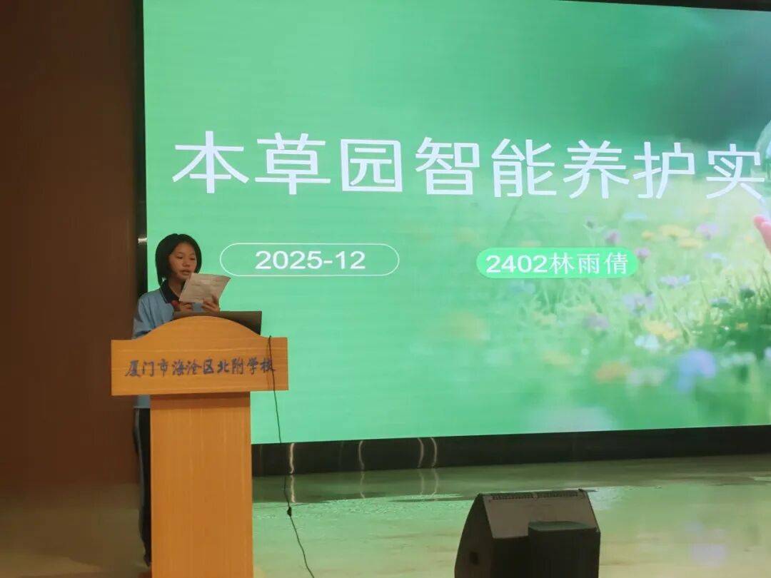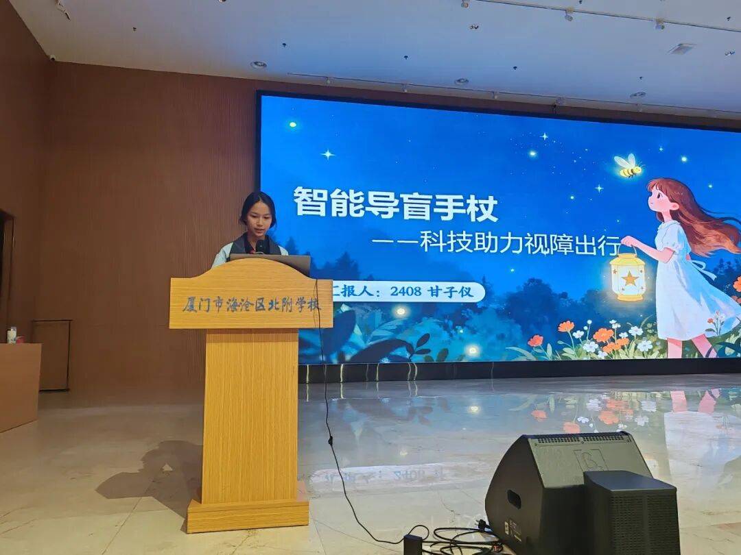讲座后,北附学校多名学生登台汇报了污水净化装置、本草园智能养护实验、眼球结构、耳机对耳的影响以及智能导盲手杖等领域的探究成果。 ! f: F5 C$ |9 H: \1 y, x