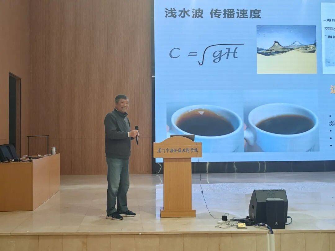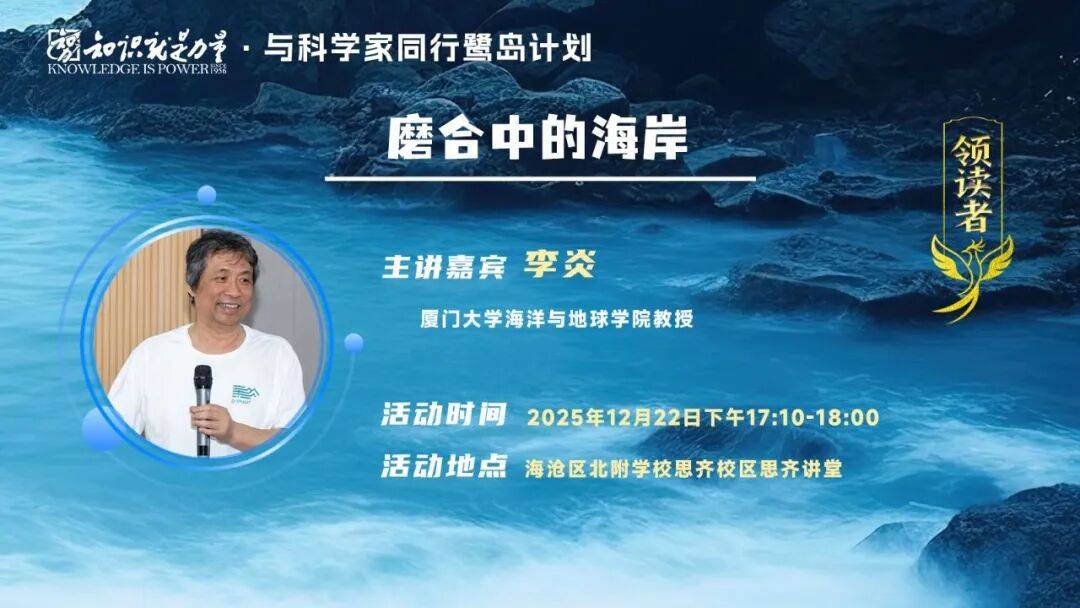 3 z3 ? D- _6 ]/ F 12月22日下午,作为“知识就是力量·与科学家同行鹭岛计划”的重要落地活动,《知识就是力量》科学家领读者、厦门大学海洋与地球学院李炎教授应邀走进厦门市海沧区北附学校思齐校区,为约300名七、八年级学生带来了一场题为《磨合中的海岸》的专题讲座,并重点分享了“封而复疏的海峡”的演变过程。 + i( b* U% }1 u7 N7 U+ _2 g) ?1 ]