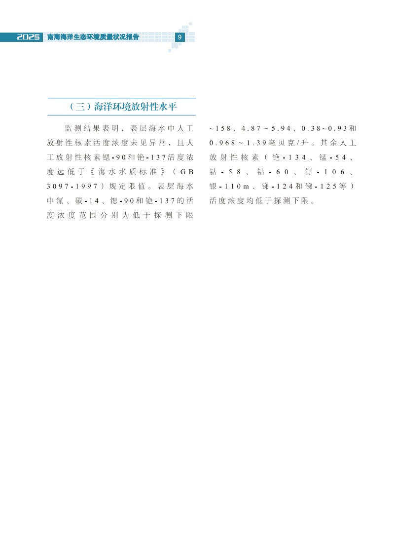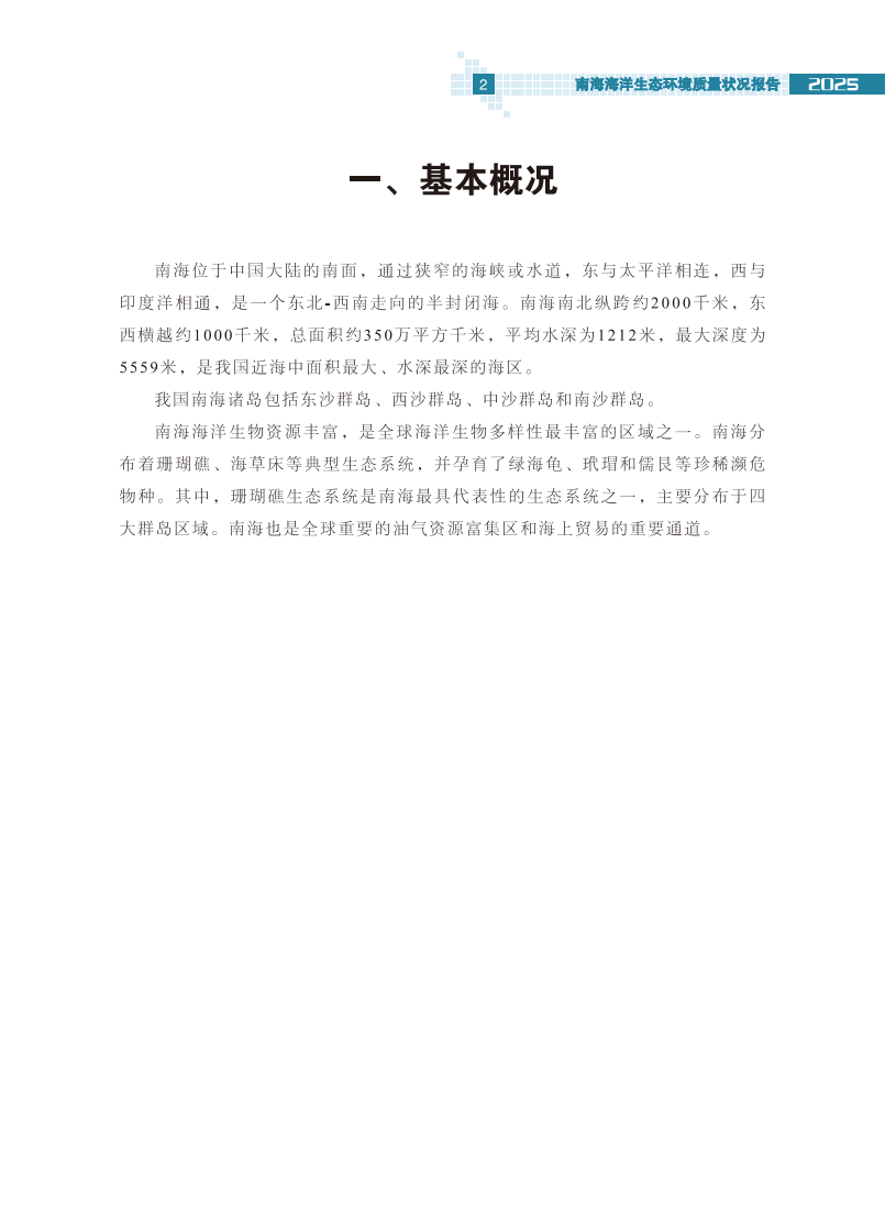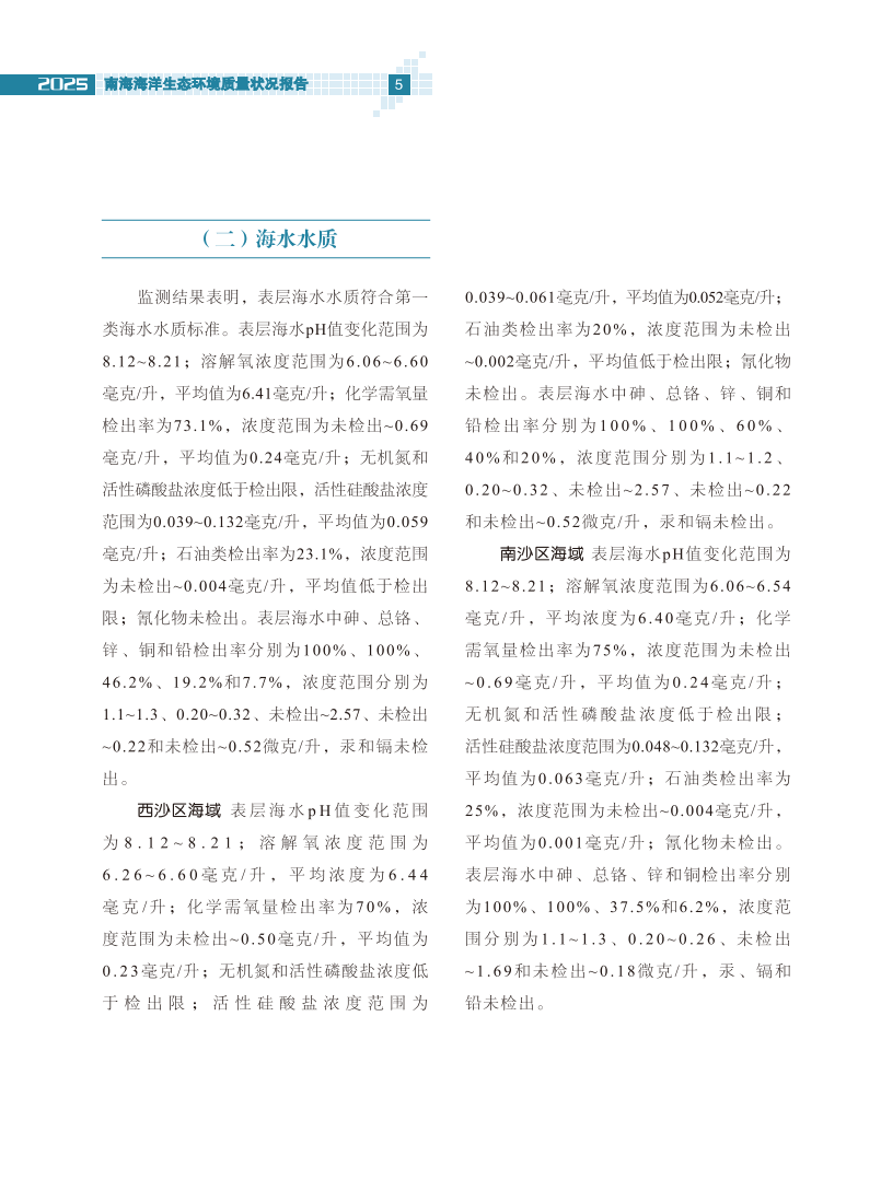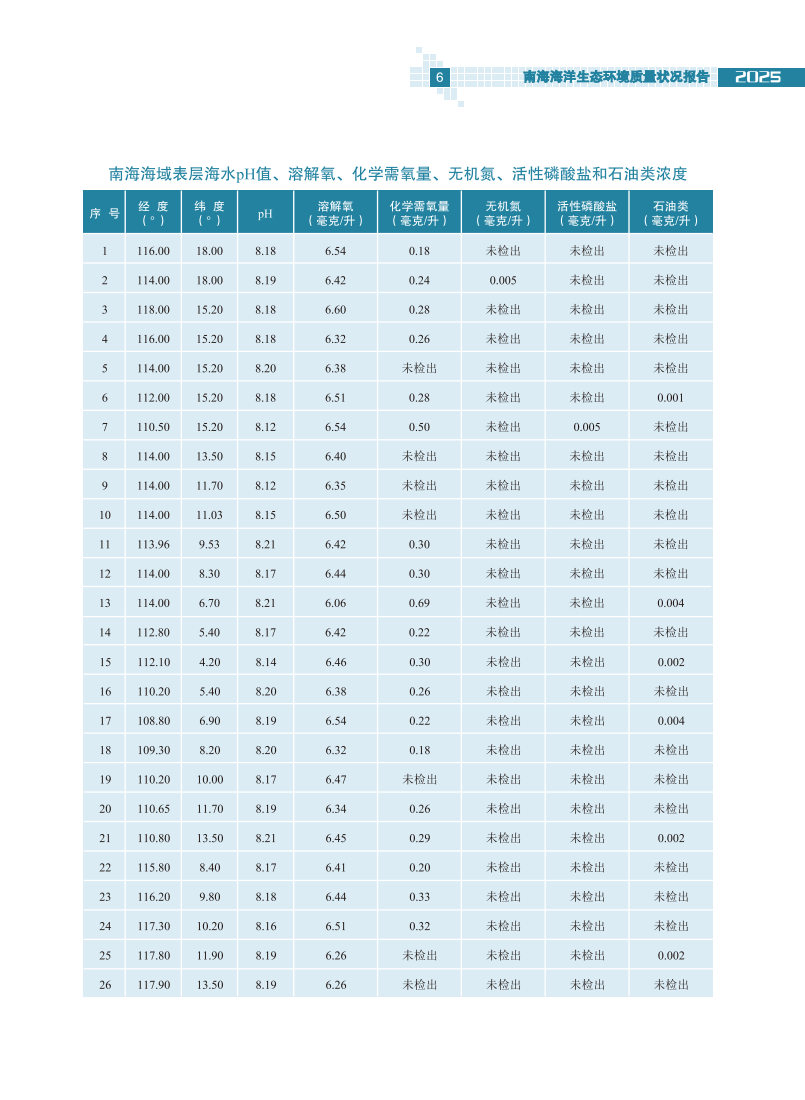 2025年南海海洋生态环境质量状况报告由多部门联合编制,于2026年3月发布。报告基于2025年5~6月在南海中南部26个监测点位的监测数据,综合运用船舶定点、走航及卫星遥感等技术,从海水环境、海面垃圾与微塑料、温室气体、岛礁生态等方面全面分析南海生态环境状况,整体显示南海海域生态环境质量良好,核心指标符合自然分布特征。