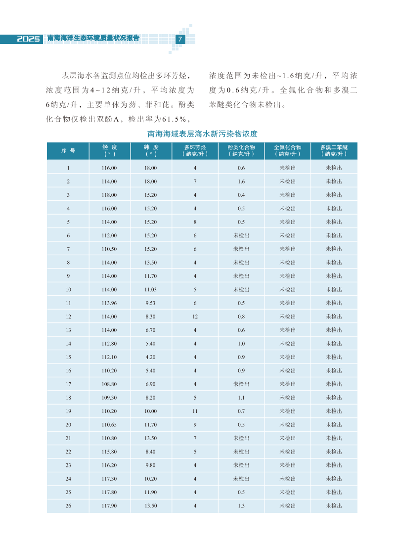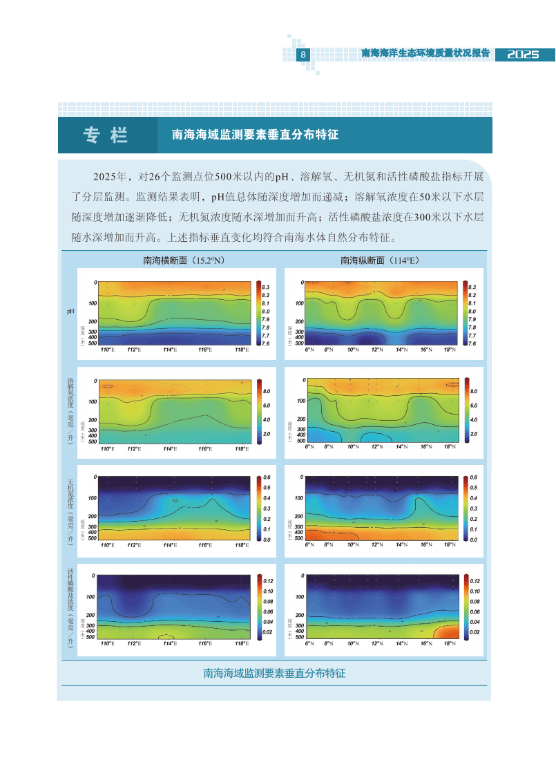 & S1 ^6 p V# S- {& G0 ?8 w% X/ H 南海作为我国面积最大、水深最深的近海海区,生物与资源丰富,拥有珊瑚礁等典型生态系统及多种珍稀濒危物种。本次监测显示,南海表层海水水质达标一类标准,pH、溶解氧等基础指标均符合南海水体自然特征,多环芳烃、酚类化合物浓度较低,全氟化合物等未检出,人工放射性核素活度浓度无异常且远低于限值,西沙、南沙分区海域水质指标也均处于良好水平,500米内水质指标垂直分布同样符合自然规律。