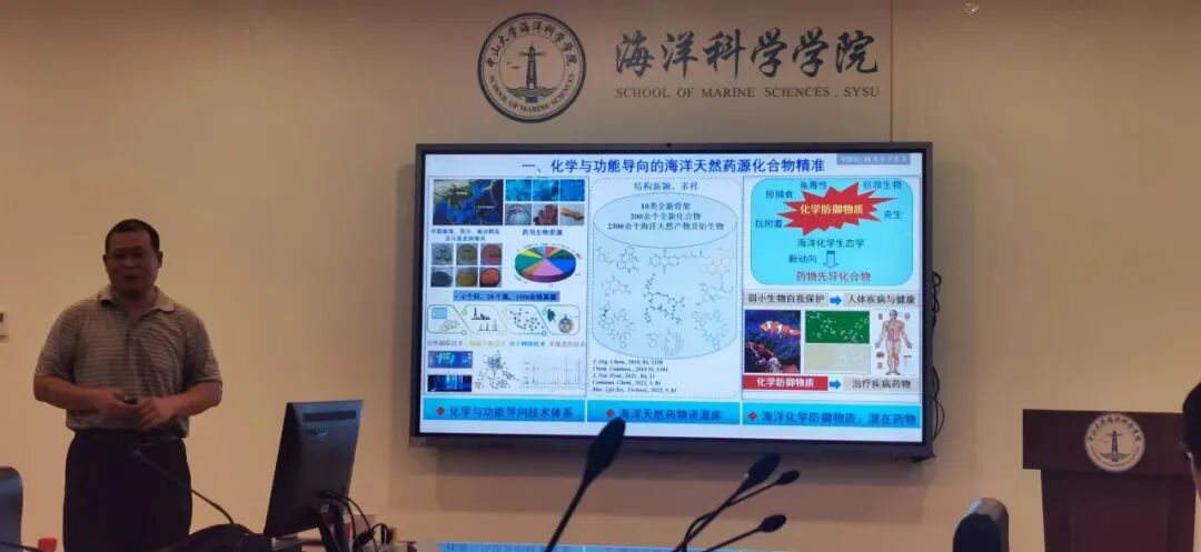 讲座中,邵长伦教授首先介绍了天然产物及其衍生物在药物研发中的重要性,并介绍了国际海洋药物的发展态势和面临的挑战。随后,他详细讲解了基于海洋化学生态学的药用生物资源发现与开拓,如化学与功能导向的海洋天然产物的挖掘、海洋天然药物资源库的构建及基于化学防御物质导向的药物先导化合物的发现等。 4 \, K! R0 c2 [% Z( r