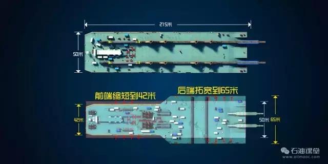 + s+ }8 u% G$ V 将船体前100米的宽度减小至42米,便于进入导管架内;为了保证浮力,把后100米的船体宽度拓宽到65米(船东老板心痛不?)。 终于,驳船改造完成,平台和导管架对接在即!+ I) G8 U) C" Q: q& H# h$ M