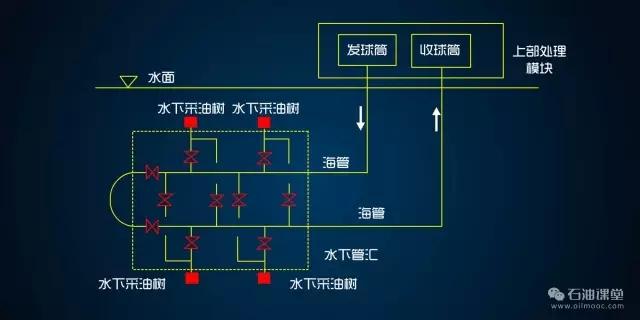 水下生产系统包括油井、井口头、采油树、接入出油管系统和控制油井的操纵设备。井口头和采油树都在海底。对比海上平台,水下生产系统不会受到海况和水深的影响。 8 \+ G$ h4 Z8 R