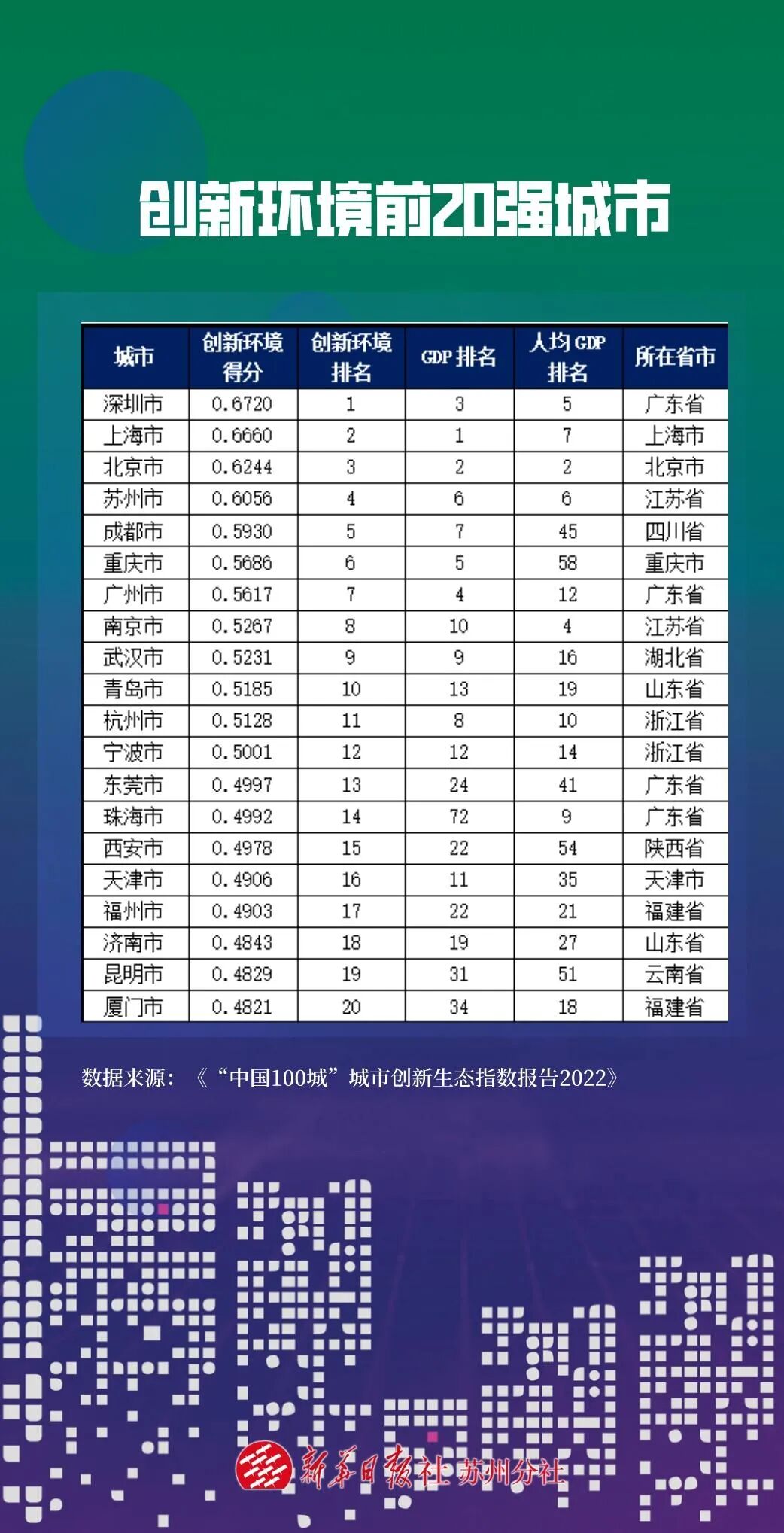 4 }$ \- w' ~1 |% F" ~# `8 h7 ]+ F 2022年《“中国100城”城市创新生态指数报告》是由苏州创新生态研究院施琴芬博士牵头,协同中国科学院科技战略咨询研究院张秋菊团队、南京审计大学于娱团队、南京邮电大学朱卫未团队、苏州科技大学吴征天团队、江苏科技大学吴洁团队、清华大学陈劲团队以及国务院发展研究中心田杰棠、新华社中国财富研究院张庆源、上海科学院李万等近百人形成的联合研究成果。报告中,“中国100城”城市创新生态指数年度排名20强、创新主体前20强城市、创新协同前20强城市已对外发布,创新环境前20强城市发布后,还将陆续发布创新主体规模前20强、创新主体投入前20强、创新主体产出前20强、创新协同平台前20强、创新协同互动前20强、创新国际合作前20强、创新投资环境前20强、创新生活环境前20强,及长三角、江苏省、G60科创走廊3份分析报告。根据项目组测算,创新环境前20强城市的区域、梯度、位差与维度分析结果如下: