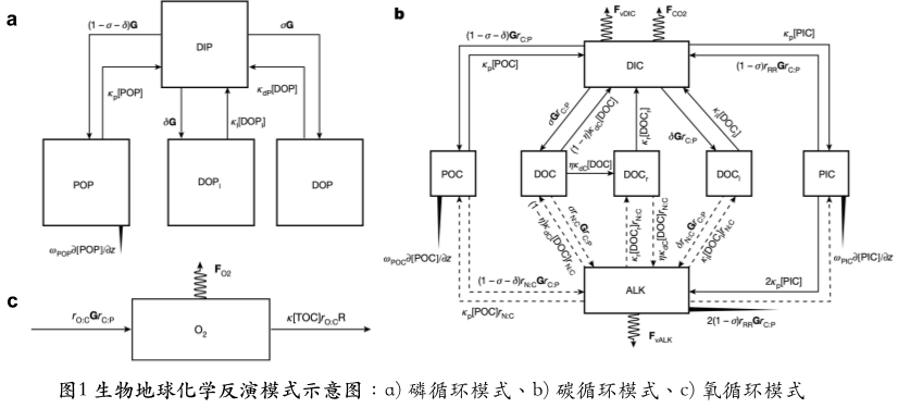 本研究基于自主研发的海洋生物地球化学逆向反演模式,通过将海洋碳、磷和氧元素的循环进行整合,建立了生物碳泵以及营养盐等参数(包括溶解无机磷DIP、溶解无机碳DIC、总碱度ALK、氧气O2和溶解有机碳DOC)的反演关系(图1)。主要的创新点在于,由水文参数的分布反推生物泵通量,避免了对海洋生物碳泵具体过程的直接模拟。这是由于当前对生物泵具体过程的认知不足且观测数据少,易造成过度参数化和对同一过程的重复计算。而反推生物碳泵通量的理论支撑为:无论有机碳以何种路径输出,它必然影响水文参数的分布,如果能准确模拟上述水文参数,便可以反推有总有机碳通量。 " F5 A. I3 f. ^) Y/ @