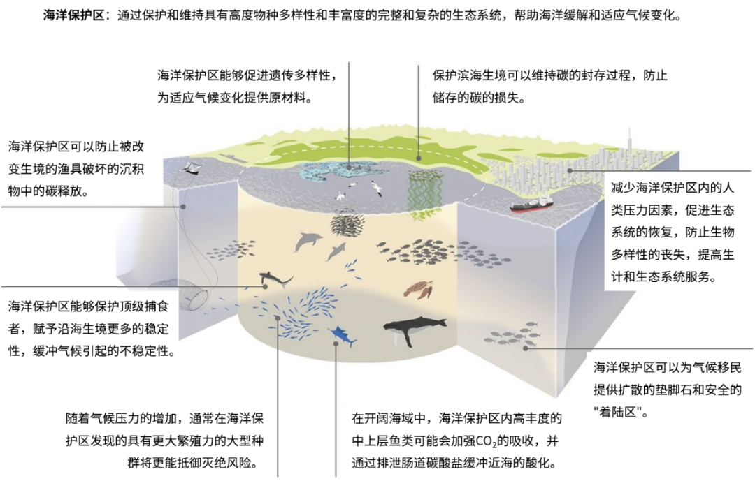 海洋保护区是基于自然的气候解决方案。基于自然的气候解决方案(NCS)是保护、恢复或改进土地、沿海和海洋生态系统,增加碳储存和避免温室气体排放的行动。到2030年,这些行动预计将支持全球平均气温上升限制在2°C以内所需的气候变化行动的三分之一。作为主要的海洋管理和保护工具,海洋保护区支持海洋生态系统适应和缓解气候变化。在有效实施的海洋保护区中,渔业捕捞种群的丰度、生物量和生物多样性增加促进了生态系统的稳定性、维护了渔业社区的生计和粮食安全,最终贡献于海洋生态系统和沿海社区对气候变化的适应性。健康的海洋具有调节气候的服务功能,有效实施的海洋保护区通过重建鱼类种群和使得海洋非生物碳汇过程免受干扰等机制能够加强海洋的碳储存,从而减缓气候变化。近年来全球海洋保护区面积不断扩大,对海洋缓解和适应气候变化产生积极作用。