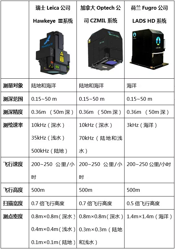 . Q( L+ b# u/ Y8 p% t0 u 进入2000年后,主要的机载激光测深系统已经完全转化成商业产品,并且融入了光谱、相机等多源数据获取能力,多源数据处理和分析软件得到进一步完善,形成了完整的软件产品线。随着激光技术的发展,产品的硬件性能也进一步提升,尤其体现在测量点密度上,较前一代产品提升达到10倍。部分产品还针对深度小于15m的浅水区域增加了专门的高密度探测通道,进一步提升海陆交界区域的测点密度。同时,开发机载激光测深系统的公司开始提供针对不同用户需求的定制化产品,并且扩展了高密度陆地同步测量功能,满足用户对于海陆一体化测绘的需求。下面是国际上有代表性的机载激光测深系统的指标情况。