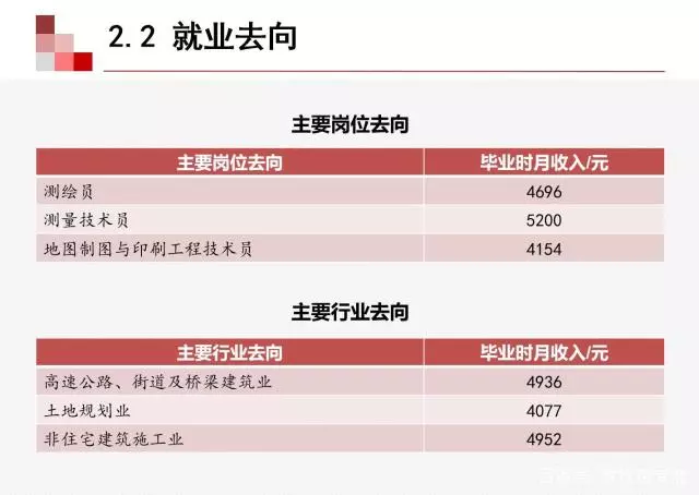 毕业生规模一般,社会需求一般;就业率排第16名,比较高;就业满意度排第11,非常高;毕业薪酬水平排第46名,在平均水平;毕业后去向最多的行业是高速公路、街道及桥梁建筑业、土地规划业、非住宅建筑施工业;毕业后去向最多的岗位是测绘员、测量技术员、地图制图与印刷工程技术员。 : k/ F* \4 L( Y9 `8 `/ e' s6 s