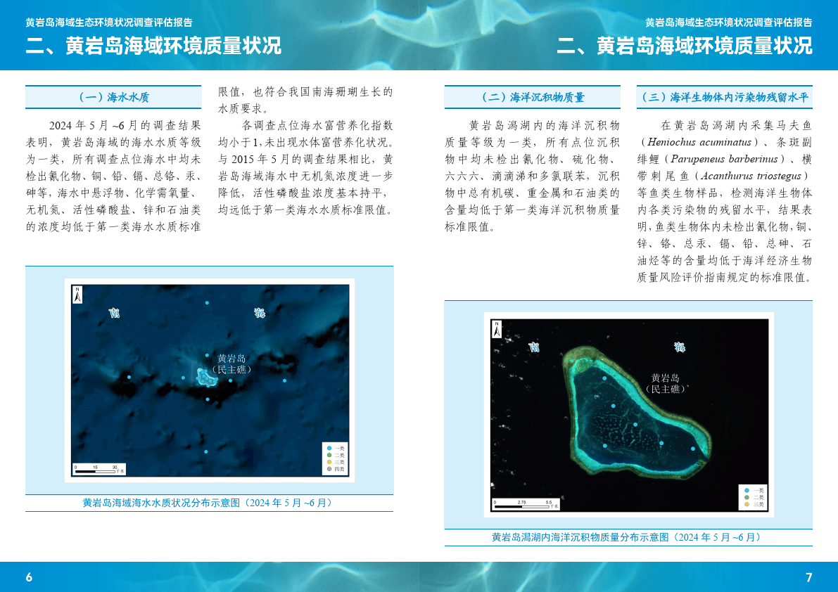 ! D( H4 _) r: Z5 { 2024 年 5 月 ~6 月的调查结果 表明,黄岩岛海域的海水水质等级 为一类,所有调查点位海水中均未 检出氰化物、铜、铅、镉、总铬、汞、 砷等,海水中悬浮物、化学需氧量、 无机氮、活性磷酸盐、锌和石油类 的浓度均低于第一类海水水质标准 限值,也符合我国南海珊瑚生长的 水质要求。 5 {2 U' S/ o! ~5 F