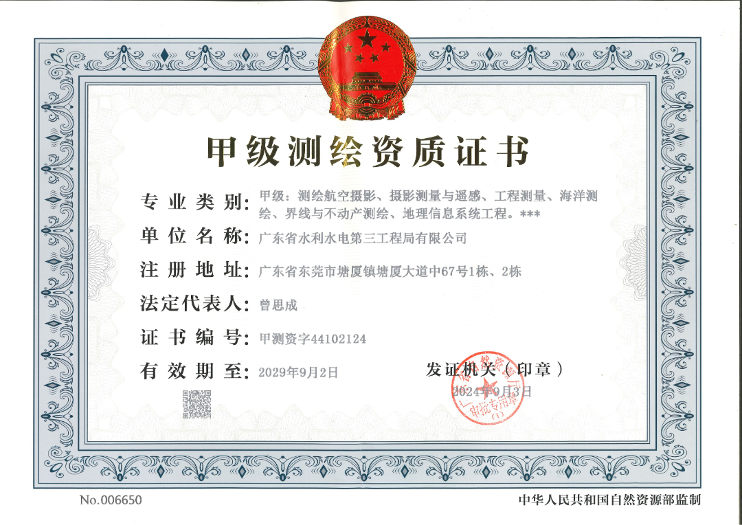 6 f' @+ g a9 r% F0 X 近日,经广东省自然资源厅批准,公司成功取得海洋测绘甲级资质,该等级为测绘行业海洋测绘专业最高等级。 q7 H, R6 N) v5 q. ]/ V