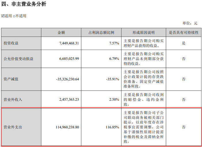 - y8 B& `0 f& a2 p 报告中提到了,经相关部门提示,全资子公司联动商务(支付牌照主体公司——联动优势电子商务有限公司)发现以前年度存在涉税事宜需要调整,需缴纳相关各项税费及滞纳金合计约1.1亿元。基于谨慎性原则,公司将上述相关税费及滞纳金计入2024年上半年当期损益。