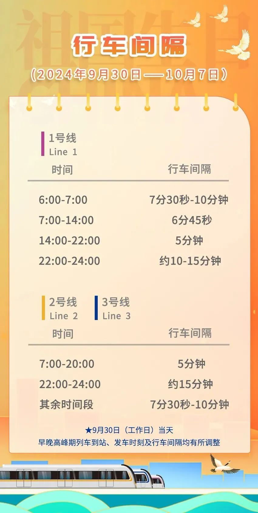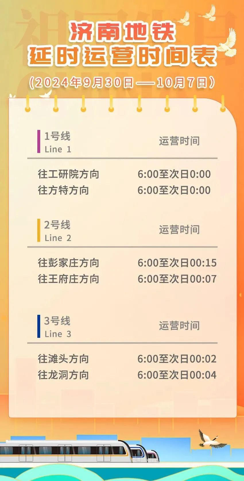 【济南地铁将延长营业时间】济南轨道交通9月27日发布:2024年国庆假期即将来临,为方便市民乘客出行,济南地铁将于9月30日至10月7日延长线网运营服务时间。 9 W9 T B& X/ f3 X. m