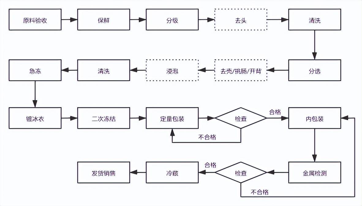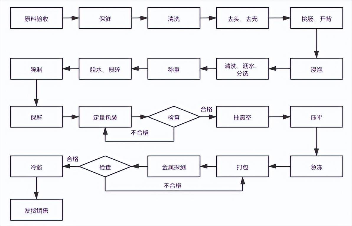 注:由于公司虾类产品的种类较多,因此在加工时会根据实际生产需要,选择性执行去头、去壳、挑肠、开背等加工流程 : |# _3 d, L$ _% ^& _