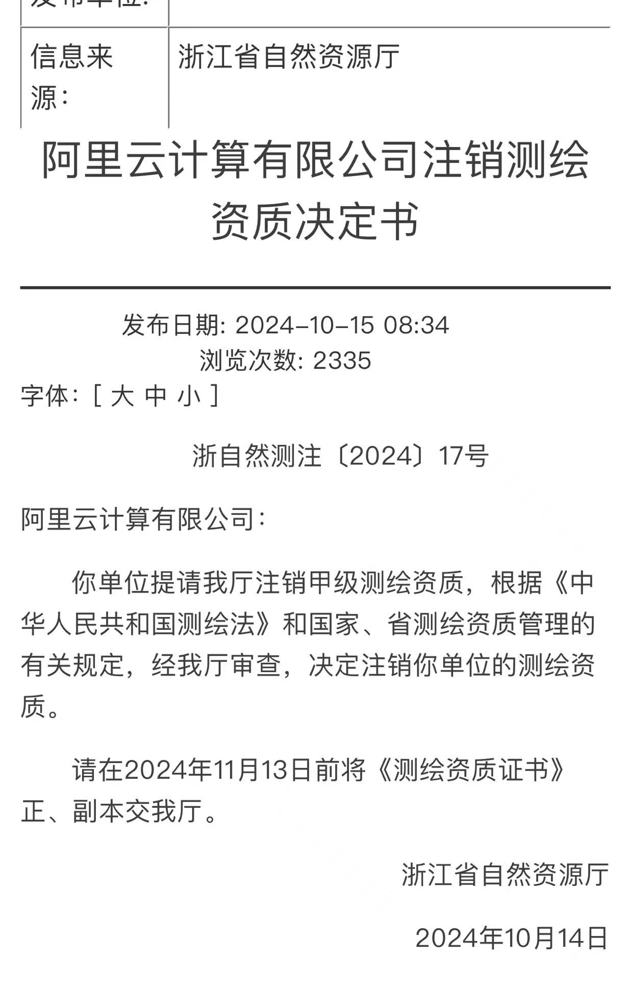 * I. P6 f n- Z 根据浙江省自然资源厅官网10月15日公示信息显示,阿里云计算有限公司提请注销甲级测绘资质。根据《中华人民共和国测绘法》和国家、省测绘资质管理的有关规定,浙江省自然资源厅决定注销阿里云测绘资质。