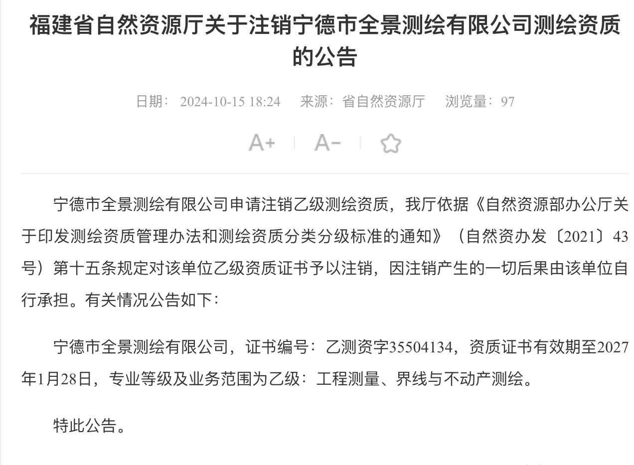 福建省自然资源厅于10月15日发布公告称,宁德市全景测绘有限公司申请注销乙级测绘资质,福建省自然资源厅依据《自然资源部办公厅关于印发测绘资质管理办法和测绘资质分类分级标准的通知》(自然资办【2021】43号)第十五条规定对该单位乙级资质证书予以注销。