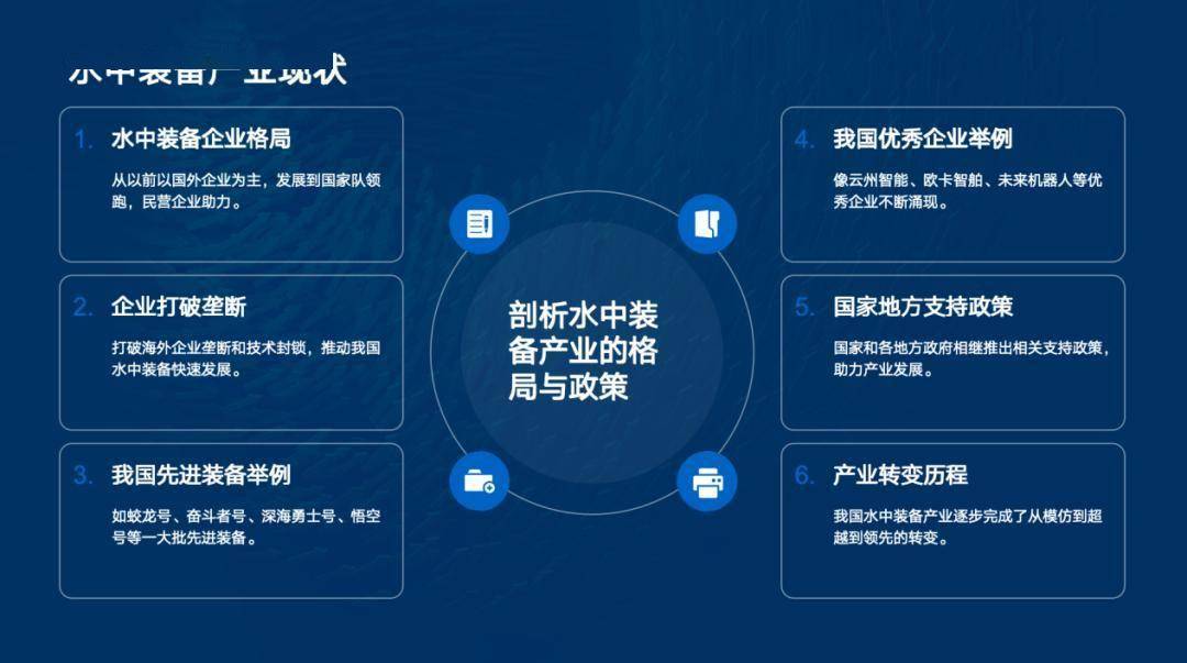 具体到我国水中装备的发展过程和现状,早年间,中国海洋装备领域的核心技术和高端产品长期被康斯伯格、ABB等欧美企业垄断,国产船舶和海洋装备的发展较缓慢,普遍存在产品体积和重量较大、功能相对单一、效率低下,而且污染严重等问题。随着科技的进步,中国的水中装备产业已经完成了从追跑到领跑的转变,在0至1万1千米间每个层级的海洋深度下,都有中国国产装备的身影。市场也涌现出了一大批相关企业,比如国家队的中船、中航天、中石油,中海油等,民营主机/船厂欧卡智舶、云州智能、未来机器人、纳百、博雅工道等,同时也涌现出了大批打破了国际垄断的先进海洋装备,比如水下的蛟龙号、奋斗者号、悟空号等。 0 ?' d; w- l8 ]6 p& U! g! M& v# z
