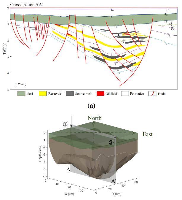 本研究为未来海底碳封存的数据采集与选址规划提供了重要参考。在沉积规模分析中,优先筛选了区域性盖层发育良好的区域(如图2标黄部分)。然而,断裂带仍是封存安全的主要隐患。建议通过部署新钻井与采集高精度三维地震数据,以精确刻画断裂带的空间展布、计算页岩剥离比,并开展地质力学模拟,评估其在注入压力下的再激活风险。综上所述,在项目前期选址阶段,应极力规避此类断裂密集发育区,以保障封存体的长期稳定性。 1 M( D3 ~% ^5 W' @