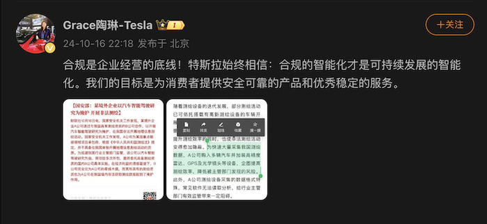 也有人猜测A公司是特斯拉,而特斯拉的表态也很快,在当天晚上就声明了“合规的智能化才是可持续发展的智能化”,相当于否认了这件事与自己有关。
