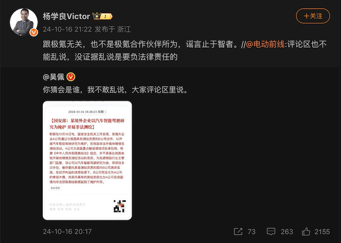 在研究A公司是谁的同时,也有人在分析B公司的身份,有不少人将Mobileye与最近频频登上热搜的极氪汽车关联了起来。当晚,吉利集团高级副总裁杨学良在微博回应道:“跟极氪无关,也不是极氪合作伙伴所为,谣言止于智者。”且极氪今天也进行了回应,“希望大家不信谣不传谣”。 " O9 Z6 K5 u3 t' b9 ?9 ^