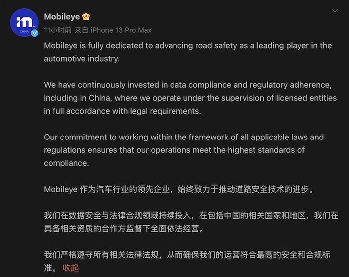 比如这个境外的A公司,有不少人猜测是以色列公司Mobileye,因为昨天碰巧还有另一个大新闻——《中国网络空间安全协会披露英特尔产品安全漏洞问题频发、可靠性差、监控用户、暗设后门等问题,建议启动网络安全审查》,而Mobileye正是英特尔旗下公司。所以今天凌晨,Mobileye在官方微博上发布了声明,称Mobileye是在“具备相关资质的合作方监督下全面依法经营”,没有进行过非法的测绘工作。 2 E% C9 U* A" `& a; E