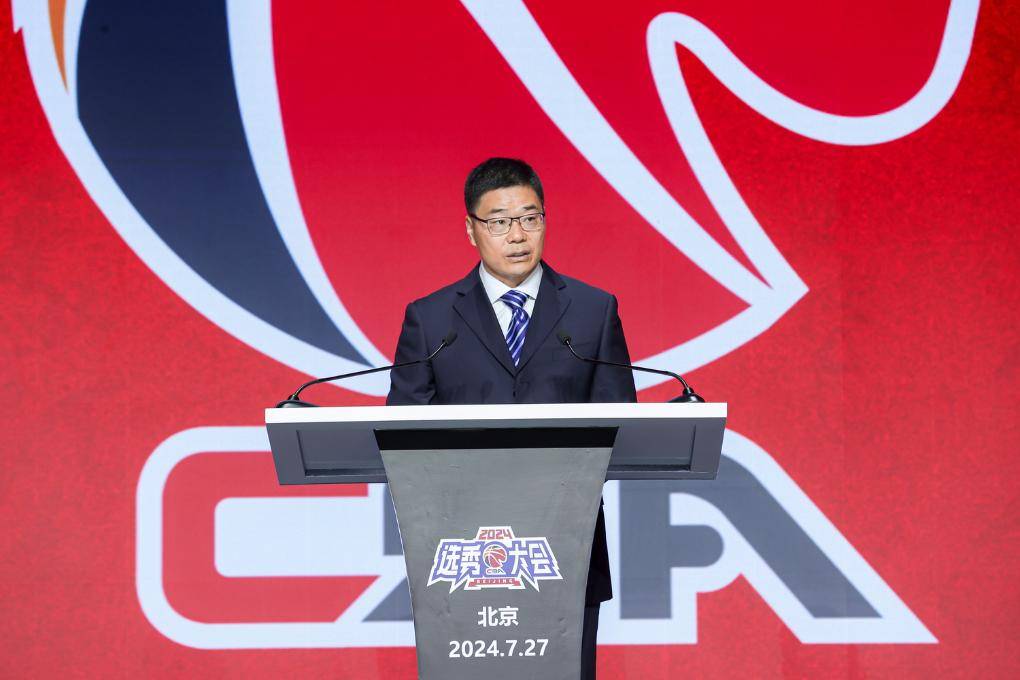 7月27日,2024年中国男子篮球职业联赛(CBA)选秀大会在北京首钢园举行。图为郭振明在选秀大会上致辞。新华社发