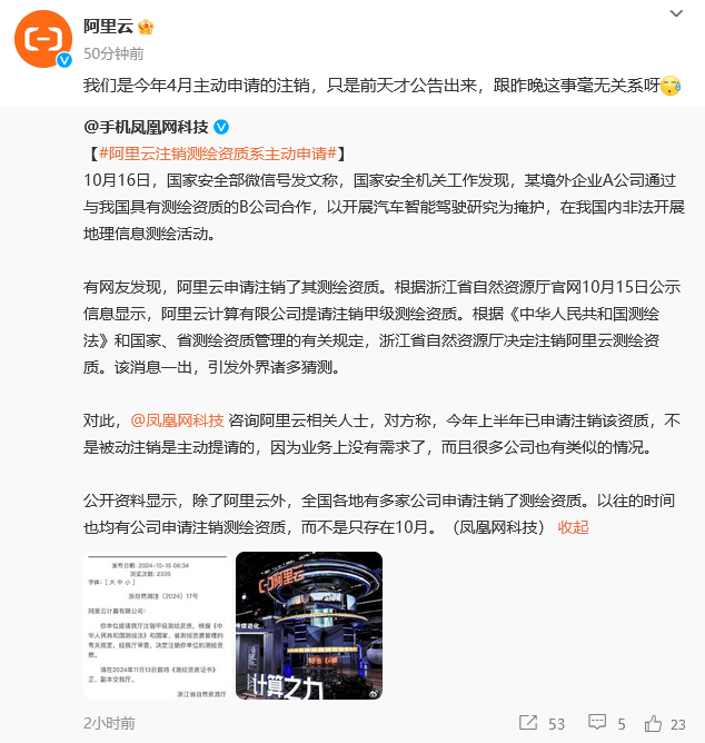10月17日,浙江省自然资源厅官网15日发布《阿里云计算有限公司注销测绘资质决定书》,决定书显示,“你单位提请我厅注销甲级测绘资质,根据《中华人民共和国测绘法》和国家、省测绘资质管理的有关规定,经我厅审查,决定注销你单位的测绘资质。”