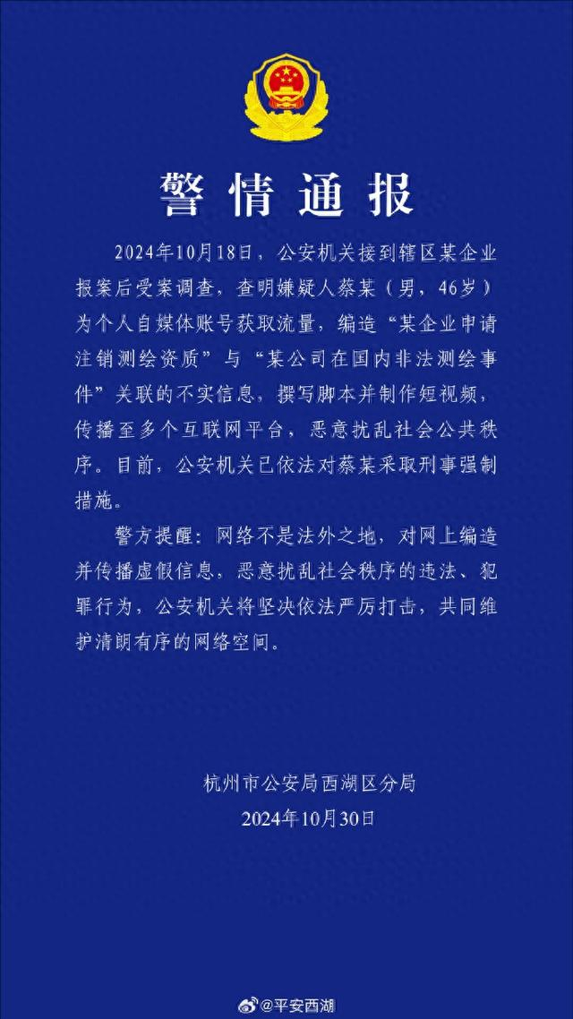 ; ^5 Z1 e9 I; V% U 据微博@平安西湖 消息,杭州市公安局西湖区分局30日发布警情通报称,公安机关接到辖区某企业报案后受案调查,查明嫌疑人蔡某(男,46岁)为个人自媒体账号获取流量,编造“某企业申请注销测绘资质”与“某公司在国内非法测绘事件”关联的不实信息。目前,蔡某已被采取刑事强制措施。