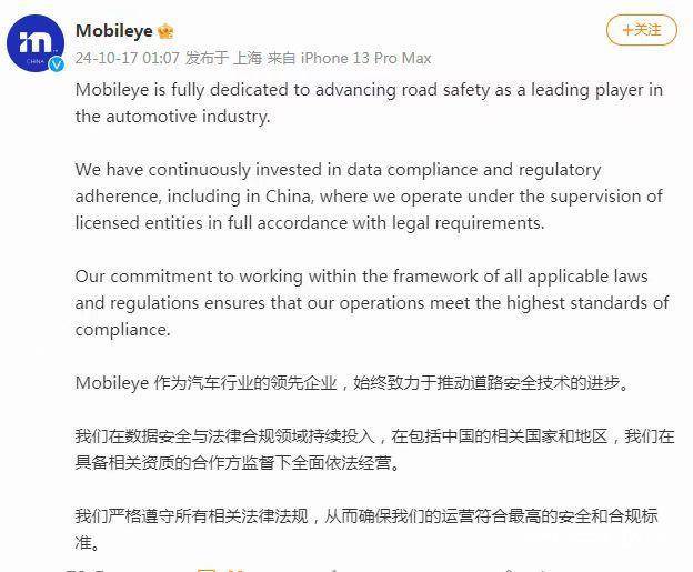 ; ~1 ?! y" G6 {$ J: B3 D1 x 10月17日凌晨,Mobileye中国官方微博也发布声明,称公司在具备相关资质的合作方监督下全面依法经营,并严格遵守所有相关法律法规,从而确保运营符合最高的安全和合规标准。 ! a# b& M; M& f. R