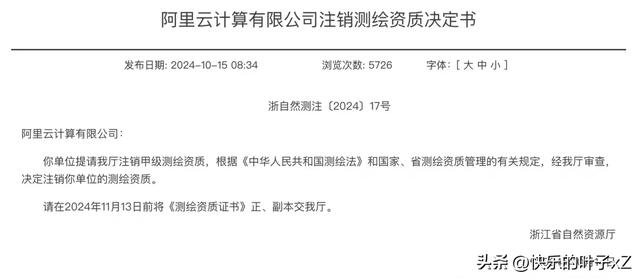 # I! W, {) `. p 此外,浙江省自然资源厅官网10月15日发布《阿里云计算有限公司注销测绘资质决定书》,决定书显示,“你单位提请我厅注销甲级测绘资质,根据《中华人民共和国测绘法》和国家、省测绘资质管理的有关规定,经我厅审查,决定注销你单位的测绘资质。” ; |5 Q0 B* {+ g: s9 {& O" ?
