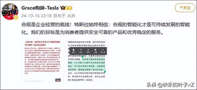 - V% Y+ y/ _( ?3 c7 c) i 特斯拉对外事务副总裁@Grace陶琳-Tesla 16日回应称,“合规是企业经营的底线!特斯拉始终相信:合规的智能化才是可持续发展的智能化。我们的目标是为消费者提供安全可靠的产品和优秀稳定的服务。” 9 G. ?+ t) k" E8 q+ J