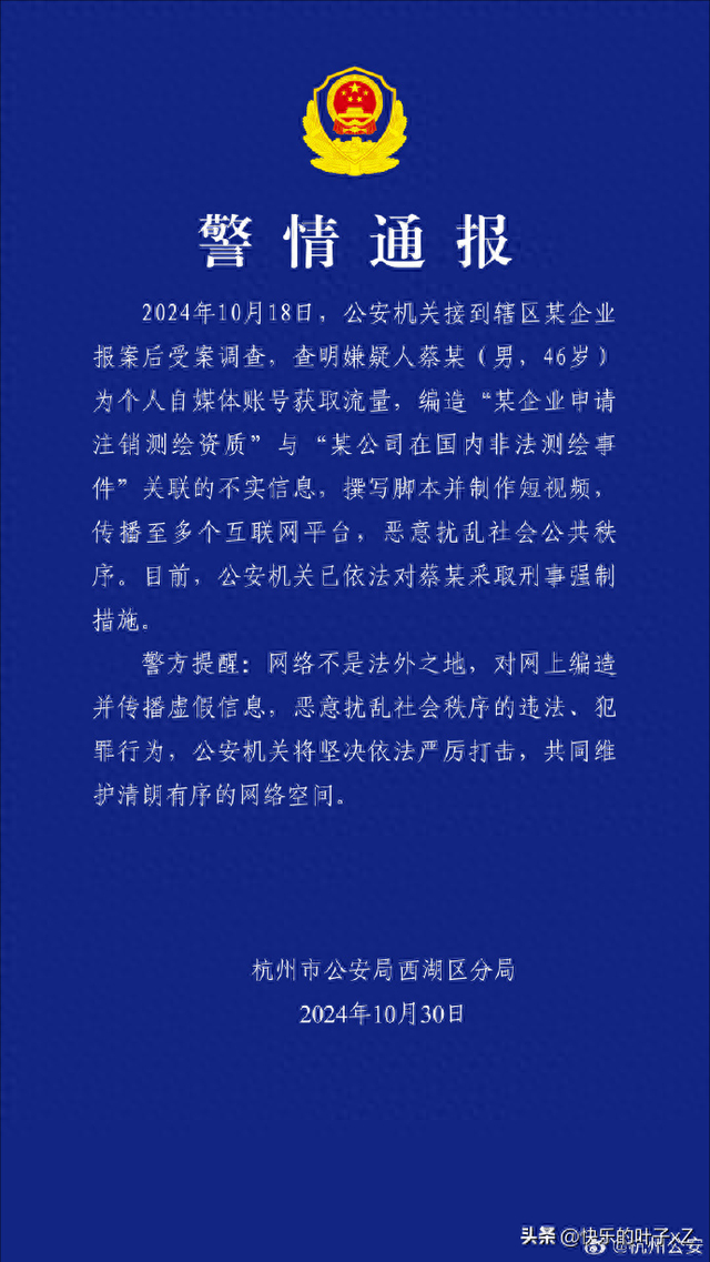 10月30日,杭州市公安局西湖区分局发布警情通报:2024年10月18日,公安机关接到辖区某企业报案后受案调查,查明嫌疑人蔡某(男,46岁)为个人自媒体账号获取流量,编造“某企业申请注销测绘资质”与“某公司在国内非法测绘事件”关联的不实信息,撰写脚本并制作短视频,传播至多个互联网平台,恶意扰乱社会公共秩序。目前,公安机关已依法对蔡某采取刑事强制措施。 9 C7 L G8 M; L& J; Y; q1 X