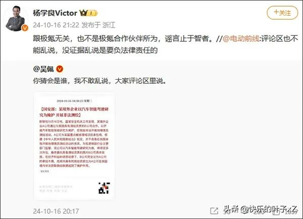 2 R j9 l5 W1 ]. ]" x) ] 浙江吉利控股集团高级副总裁@杨学良Victor 16日转发相关微博称,跟极氪无关,也不是极氪合作伙伴所为,谣言止于智者。