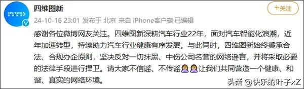 @四维图新 16日也发文称,四维图新深耕汽车行业22年,面对汽车智能化浪潮,近年加速转型,持续助力汽车行业健康有序发展。与此同时,四维图新始终秉承合法、合规办企原则,坚决反对一切抹黑、中伤公司名誉的网络谣言,并将采取必要的法律手段进行捍卫。
