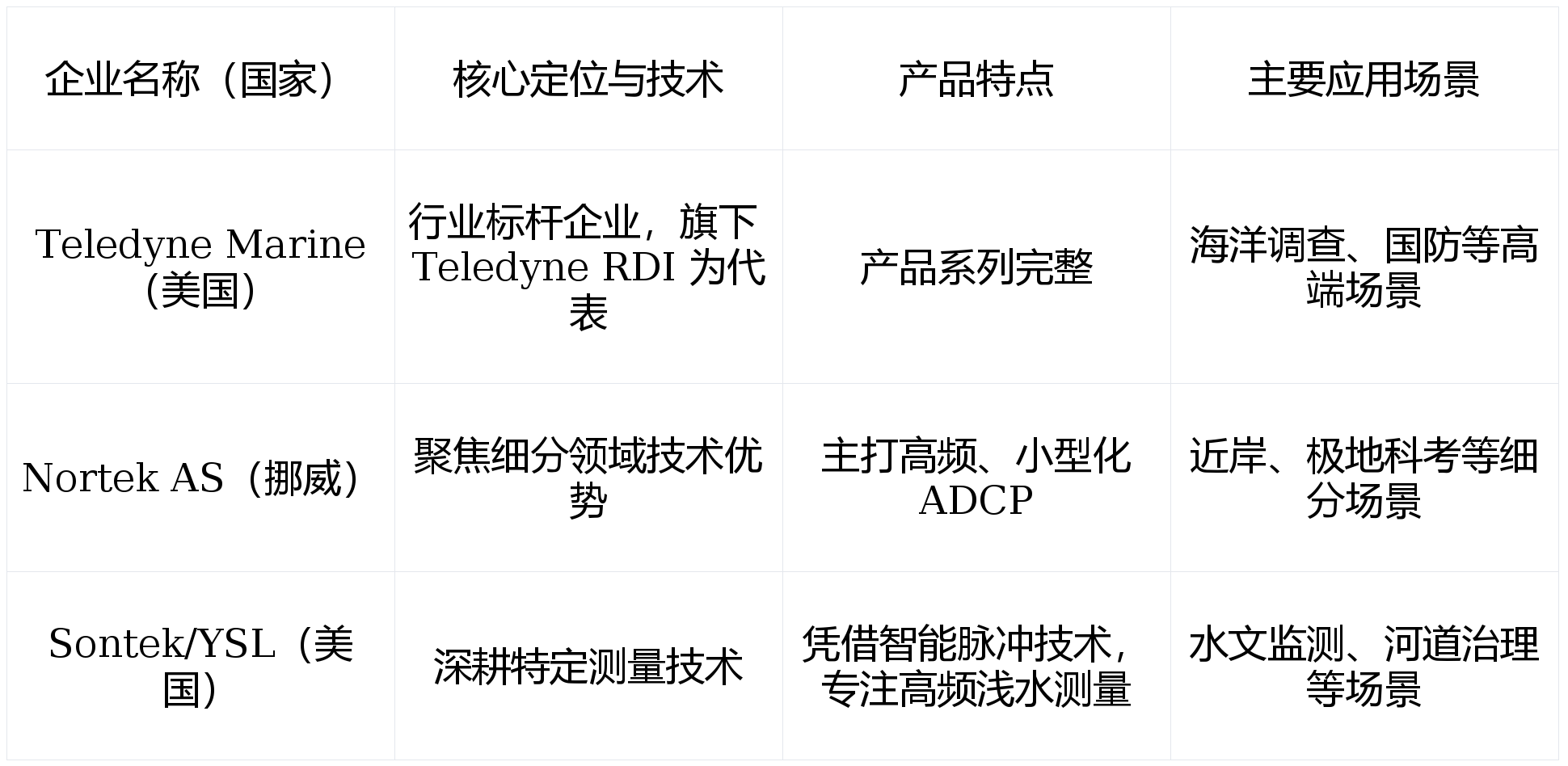 中国ADCP行业形成“政策驱动、需求牵引、企业主导、科研支撑”格局,区域布局呈现“东部集聚、全国辐射”特征,企业按技术路线与市场定位分为三大类别。 " y' Y$ F& Z+ j; a% T( r, g! e1 k