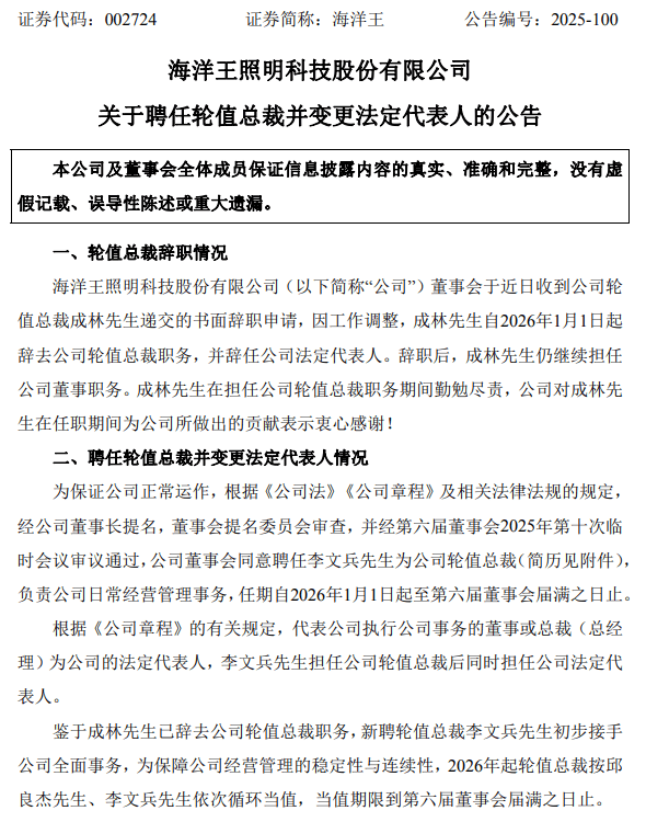 ; K1 N. p- |1 B' U: A N3 d/ C7 o 2026年开年,LED照明行业在“技术迭代加速”与“成本压力陡增”的双重背景下,头部企业管理层变动备受关注。1月6日,海洋王照明科技股份有限公司(证券简称:海洋王,证券代码:002724)发布公告,原轮值总裁、法定代表人成林因工作调整辞任相关职务(仍保留董事席位),由李文兵接任轮值总裁并同步担任法定代表人,2026年起实行“邱良杰-李文兵”循环轮值机制,任期至第六届董事会届满。这一人事调整并非孤立事件,而是企业适配行业趋势、巩固专业赛道优势的战略选择,折射出照明行业“细分制胜、稳定优先”的发展逻辑。 6 F* W; P8 A3 H( p' b) L