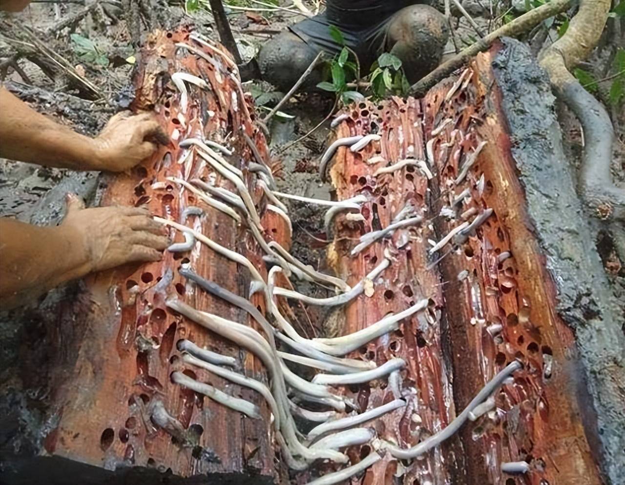 虽然名字里带个“蛆”字,长得也像条虫子,但船蛆其实是地地道道的贝类,和咱吃的生蚝、象拔蚌是亲戚 。它那两片贝壳没长在身上,而是退化成了一顶坚硬的“小头盔”顶在脑袋上,专门用来在木头里开山辟路 。