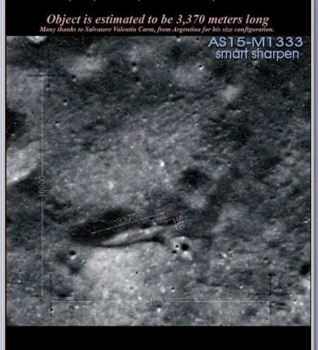 3 ^% {! b2 _3 j 事有凑巧,月球背面一直有一艘史前飞船的传闻,它的规模还真差不多能和这个“史前机场”能配上!在月球184319.78 S,1174051.45 E的位置,有一艘庞大的宇宙飞船残骸,它的高度超过500米,长度超过3300米!