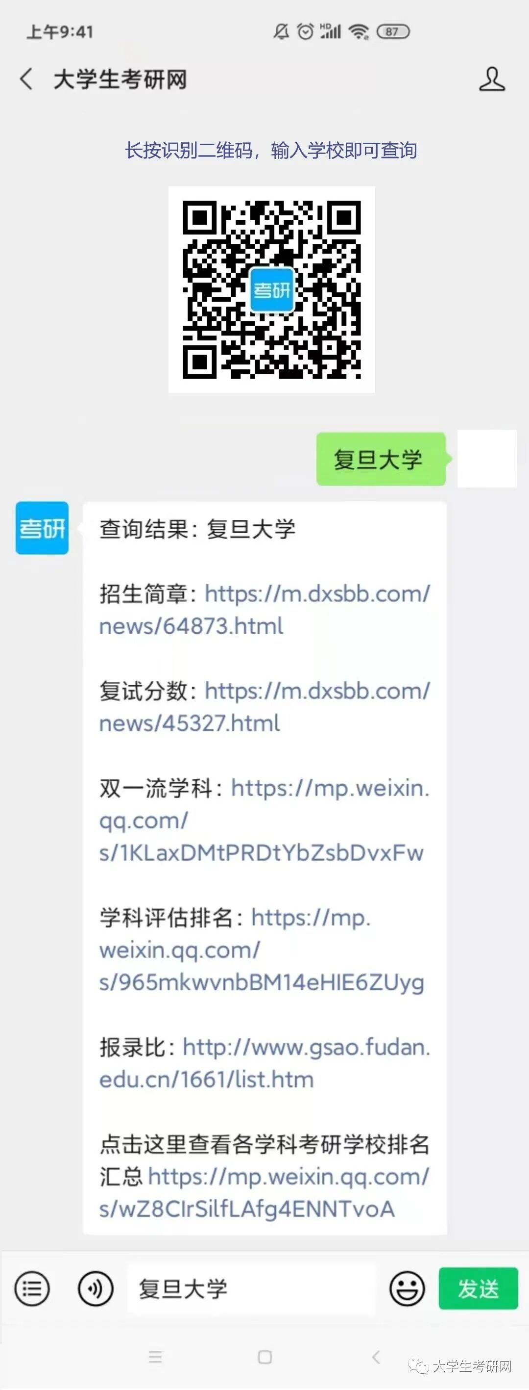 6 s* [1 M+ z1 t  如需查询更多学校信息可向本公众号后台发送学校名称方法如下图所示↓↓↓ 院校信息查询1、后台发送学校,如:复旦大学,可查询复旦大学招生简章、历年分数、专业目录、参考书目、报录比等信息2、后台发送:考研,可获取2021-2015考研真题及考研资料3、后台发送学科,如:土木工程,可查询土木工程学科各大学排名情况4、后台发送:四六级,可获取2020-2015英语四六级真题及参考答案大学生考研网,一个陪伴你考研上岸的公众号~为大家提供考研资讯、考研资料、学校资料、学科评估、四六级资料等信息查询服务。 9 I# @& C7 q1 ?2 w, p* y0 P