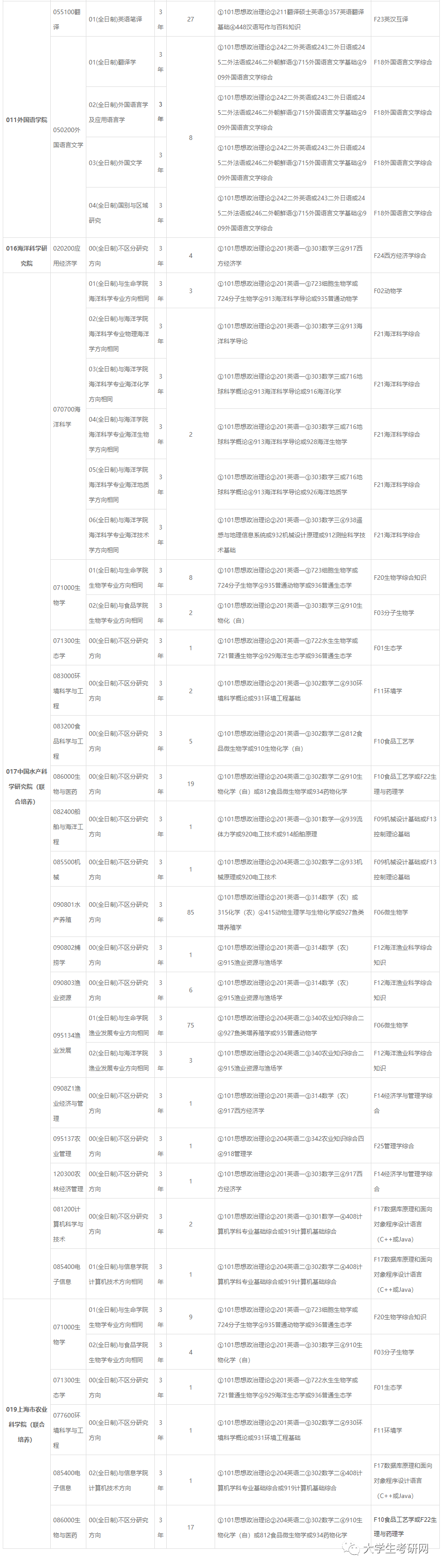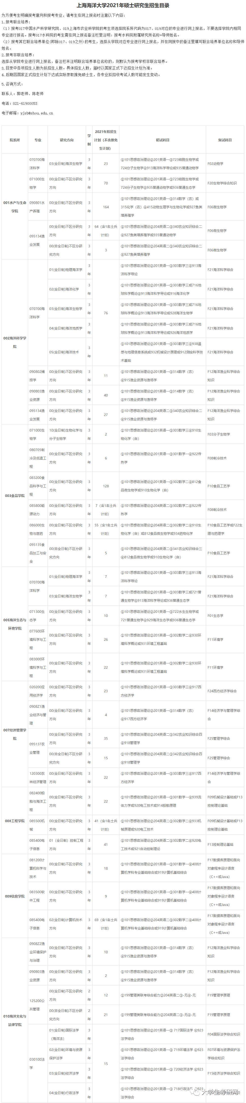 院校信息查询1、后台发送学校,如:复旦大学,可查询复旦大学招生简章、历年分数、专业目录、参考书目、报录比等信息2、后台发送:考研,可获取2021-2015考研真题及考研资料3、后台发送学科,如:土木工程,可查询土木工程学科各大学排名情况4、后台发送:四六级,可获取2020-2015英语四六级真题及参考答案以下是大学生考研网公众号为大家整理的2021年上海海洋大学考研专业目录,供大家参考:如需查询上海海洋大学招生简章、复试分数、一流学科、学科排名、报录比等信息,可向本公众号后台发送:上海海洋大学。
