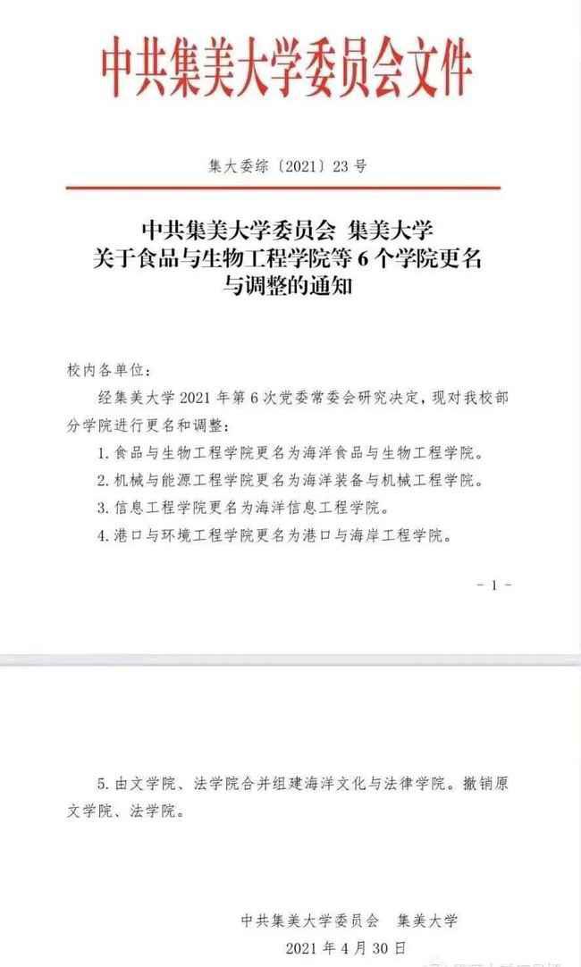 专注于高等教育数据研究的第三方机构——青塔公众号最新推文称,集美大学日前发布了《关于食品与生物工程学院等6个学院更名与调整的通知》,正式重组建立4个涉海新学院,分别为:海洋食品与生物工程学院,海洋装备与机械工程学院,海洋信息工程学院,港口与海岸工程学院。文学院、法学院合并组建海洋文化与法律学院。2 T3 e) r9 Q& ^5 J+ `
