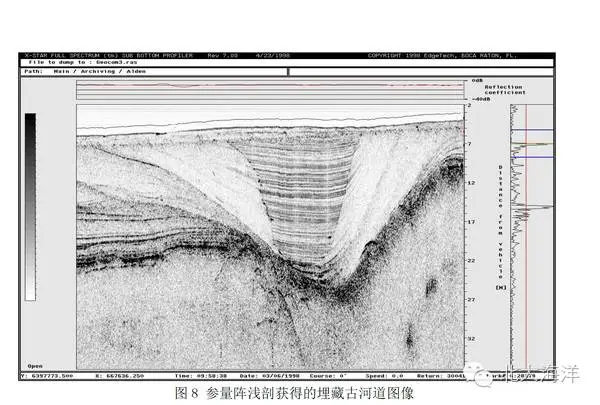' P3 t& K& r( ^5 L6 n# O 当我们需要获知海床以下浅部地层、灾害地质因素、埋设物等的分布情况时,需要使用一种工作频率相对较低,对海底地层有一定穿透能力的设备来实现,这就是浅地层剖面系统(图8)。这种系统的工作原理也是非常简单的,只是信号频率更低,能量更强,信号在各个声速界面上形成反射,水听器接收回波信号后即可形成声学地层图像。按信号频率从高到低排列,震源类型主要包括:压电陶瓷(晶体振动)、Boomer(金属撞击)、电火花(等离子体)等,当然这不是绝对的,比如参量阵技术,就是通过两个相对高频的信号通过相位叠加最终形成若干个不同频率的信号,其中就包含了频率极低的信号。