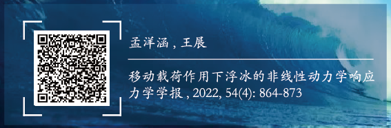 ' h0 O( {2 ~1 z% | 海洋能源开发装备在设计分析时往往需要考虑特殊的环境载荷。浮冰载荷是极区/寒区海洋能源开发装备结构设计的重要载荷之一。针对海面浮冰的非线性动力响应问题,中国科学院力学研究所的孟洋涵和王展考虑非线性、惯性和阻尼的影响,建立了浮冰三阶截断模型。基于该模型,探究了匀速局域化载荷作用下的浮冰非线性动力学响应,并将时间依赖解与实验测量数据进行比较,结果表明数值计算结果与实验记录吻合良好。 $ E! y9 _" C& W9 N6 \" f! O