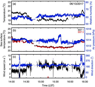 2017年6月13日半潜式海洋气象探测无人船实时获取的海上温度、湿度、气压、风速和风向以及海表温度的观测数据。红色三角代表探空火箭发射的时间。