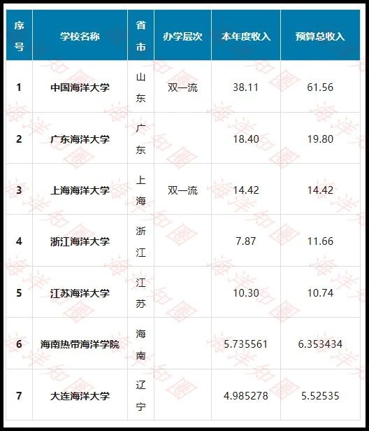 % P/ |" `' x. o1 ]1 U4 D" v小编对7所“海洋”大学2024年预算数据进行了整理,总经费排名为:中国海洋大学、广东海洋大学、上海海洋大学、浙江海洋大学、江苏海洋大学、海南热带海洋学院、大连海洋大学。7所“海洋大学”2024年度预算经费汇总" W1 ], B* E$ P- g$ _