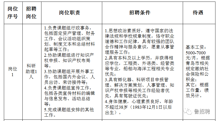 二、招聘程序1.个人报名 应聘者填写《应聘人员简历》(点击下载附件),并将《应聘人员简历》和毕业证、学位证等各类反映个人经历和能力的证明材料扫描件发送至电子邮箱:chenyujing3@ouc.edu.cn,邮件主题请以“XXX大学张三应聘岗位X”格式命名,请务必注明应聘岗位。报名截止日期:2022年1月9日。 请如实填写应聘信息,如有与实际不符,一经查实,取消其应聘资格。报名期间不接收书面简历材料,初选入围后应聘者按要求另行提供书面材料。 2.用人单位组织初审、综合考察,确定拟录用人选。初审结果和考察安排由用人单位另行通知。 3.学校研究审批,确定录用人员。 三、管理方式与待遇 1.管理方式 采用派遣方式,劳动关系由劳务派遣公司管理。 2.待遇 按各岗位视人才情况具体确定。 四、联系方式
