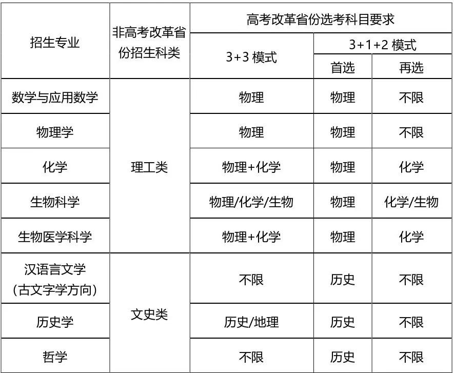 注:1.高考改革省份选考科目要求中,“物理+化学”表示物理和化学都要选考,“物理/化学/生物”表示物理、化学、生物三门课程中只选考其中一门即可,其他情况同理。 2.具体招生计划见强基计划报名平台。 三、报名方式与选拔程序 (一)报名时间和办法 4月12日至30日,考生登录山东大学强基计划报名平台(网址:https://bm.chsi.com.cn/jcxkzs/sch/10422),按要求准确、完整地完成网上报名。考生最多可报考我校3个专业志愿(第二类考生仅可报1个专业志愿),且不能兼报其他高校。 (二)考生参加全国统一高考 (三)考生确认 已报名考生须在6月12日至20日通过强基计划报名平台确认是否参加学校考核(以下简称“校考”),且须签订《山东大学2023年强基计划考生承诺书》,否则不予入围。 对于确认参加学校考核又无故放弃的考生,我校将通报生源省份考试招生机构并如实记入诚信档案。 (四)确定校考入围考生 对于已确认的第一类考生,其高考成绩须达到所在省份第一批本科录取控制分数线(简称“一本线”,合并本科批次省份参照部分特殊类型招生最低录取控制线执行,下同)上50分,对于高考成绩满分不是750分的省份,按比例折算。我校依据“高考成绩优先、遵循考生志愿”的原则,按分省分专业招生计划数的5倍,确定各省入围校考人选及其唯一入围专业(如有末位同分考生,均可入围)。 对于已确认的第二类考生,其高考成绩达到所在省份一本线即可入围,且不占第一类考生的入围名额。 (五)校考 我校于7月3日前组织校考,包括笔试、面试和体质测试。 1.笔试和面试 笔试重点考查学生相关学科的基础知识、基础理论和基础能力等,满分100分,分专业进行。 面试重点考查学生的综合素质、创新能力、兴趣志向、科研潜质和科学精神等,满分100分,分专业进行。采取专家、考生“双随机”抽签的方式,测试全程录音录像。考生综合素质档案作为重要参考。 第二类考生单独组织考核,具体办法与测试方案一并公布。 2.体质测试 考生须在50米跑、立定跳远、坐位体前屈、一分钟引体向上(男)/一分钟仰卧起坐(女)等4个项目中选择2项进行测试,执行《国家学生体质健康标准》中高三评价指标的及格标准,2项均达到及格标准即为体质测试合格,测试结果不计入校考成绩,测试不合格者不予录取。 因身体原因无法参加体质测试的考生,凭三级甲等及以上医院证明向学校申请免测,申请通过者可予以免测,视为合格。 3.校考成绩折算办法 校考成绩=笔试成绩×50%+面试成绩×50%,满分100分。 校考成绩未达到60分的考生不予录取。详细测试方案将在入围考生名单确定后公布,如遇不可抗力因素,招生流程所作调整,将另行通知。 (六)录取办法 1.综合成绩折算办法 综合成绩=高考成绩(换算成百分制)×85%+校考成绩×15% 2.确定录取名单 对于第一类考生,根据考生入围专业和我校分省分专业招生计划,按综合成绩由高至低确定强基计划预录取名单。对综合成绩相同的考生,依次比较校考成绩、高考语文加数学成绩、高考语文成绩、高考外语成绩,择优录取。 对于第二类考生,综合成绩达到所在省份第一类考生最低录取分数线的,予以录取并满足其专业志愿,所需计划不占已公布的各省强基计划名额。 学校本科招生工作领导小组按招生计划审定强基计划预录取名单,并报各省级招办审核,办理录取手续。 我校于7月5日前公布录取名单并公示录取标准。被正式录取的考生不再参加本省(区、市)后续高考志愿录取;未被录取的考生可正常参加本省(区、市)后续各批次高考志愿录取。 四、培养方案 我校强基计划按照“3+1+X”模式进行本硕博衔接培养,单独编班,单设培养方案。其中,“3”是指3年的本科培养阶段,包括通识教育、专业教育、实践环节等;“1”是指1年的本研衔接阶段,针对本学科领域以及国家重大战略需求(高端芯片与软件、智能科技、新材料、先进制造、国家安全、生物医学、国学、古典文献、考古学、马克思主义中国化、国家治理、国际问题等)设计对应的衔接课程模块,学生可选修其中一个模块;“X”是指研究生培养阶段,学生在选定的相关学科领域攻读博士学位,基本学制四年,符合博士学位授予要求的将授予博士学位。 学校对强基计划学生配备一流的师资和一流的学习条件,创造一流的学术环境与氛围,实行导师制、小班化等培养模式,畅通成长发展通道。对学业优秀的学生给予奖励,并在学术交流、公派留学方面给予专项经费支持,同时为强基计划学生分阶段颁发荣誉证书。 各招生专业培养方案详见山东大学本科招生网。 五、其他说明 1.关于学生综合素质档案。对于已建立省级统一信息平台的省份,由省级教育行政部门直接上传至强基计划报名系统;对于尚未建立省级统一信息平台的省份,由各省级教育行政部门汇总本地各中学报考学生的综合素质档案后,统一上传至强基计划报名系统;相关材料无需考生本人向我校提供。 2.对于综合素质档案造假或在学校考核中舞弊的考生,我校将取消其录取资格,将有关情况向省级招生考试机构或教育行政部门汇报。已经入学的取消学籍,毕业后发现的撤销其毕业证、学位证。学生所在中学应当对所出具的材料认真核实,出现弄虚作假情形的,我校保留采取相关措施的权利。 3.强基计划录取的考生入学后原则上不允许转专业。 4.选拔测试期间,考生的