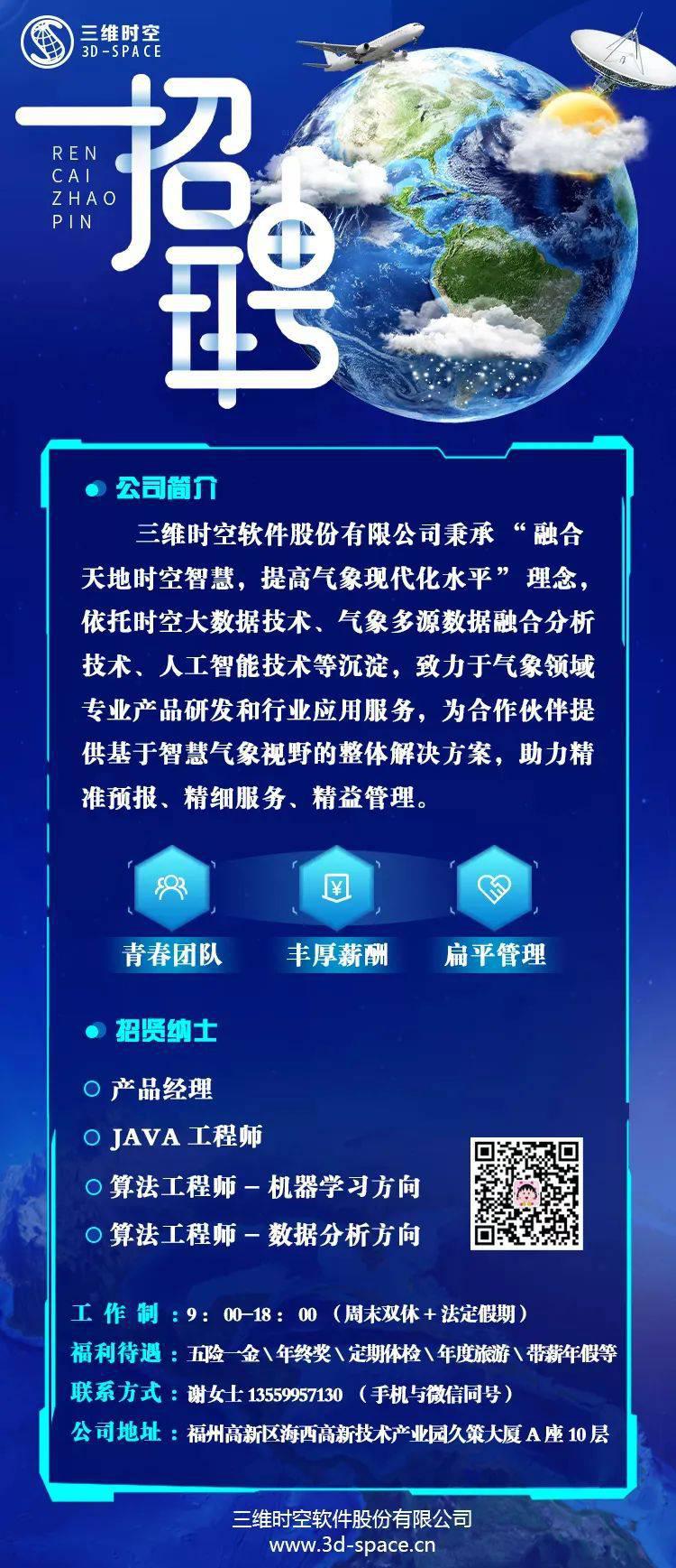 公司简介:三维时空软件股份有限公司秉承“融合天地时空智慧,提高气象现代化水平”理念,依托时空大数据技术、气象多源数据融合分析技术、人工智能技术等沉淀,致力于气象领域专业产品研发和行业应用服务,为合作伙伴提供基于智慧气象视野的整体解决方案,助力精准预报、精细服务、精益管理。