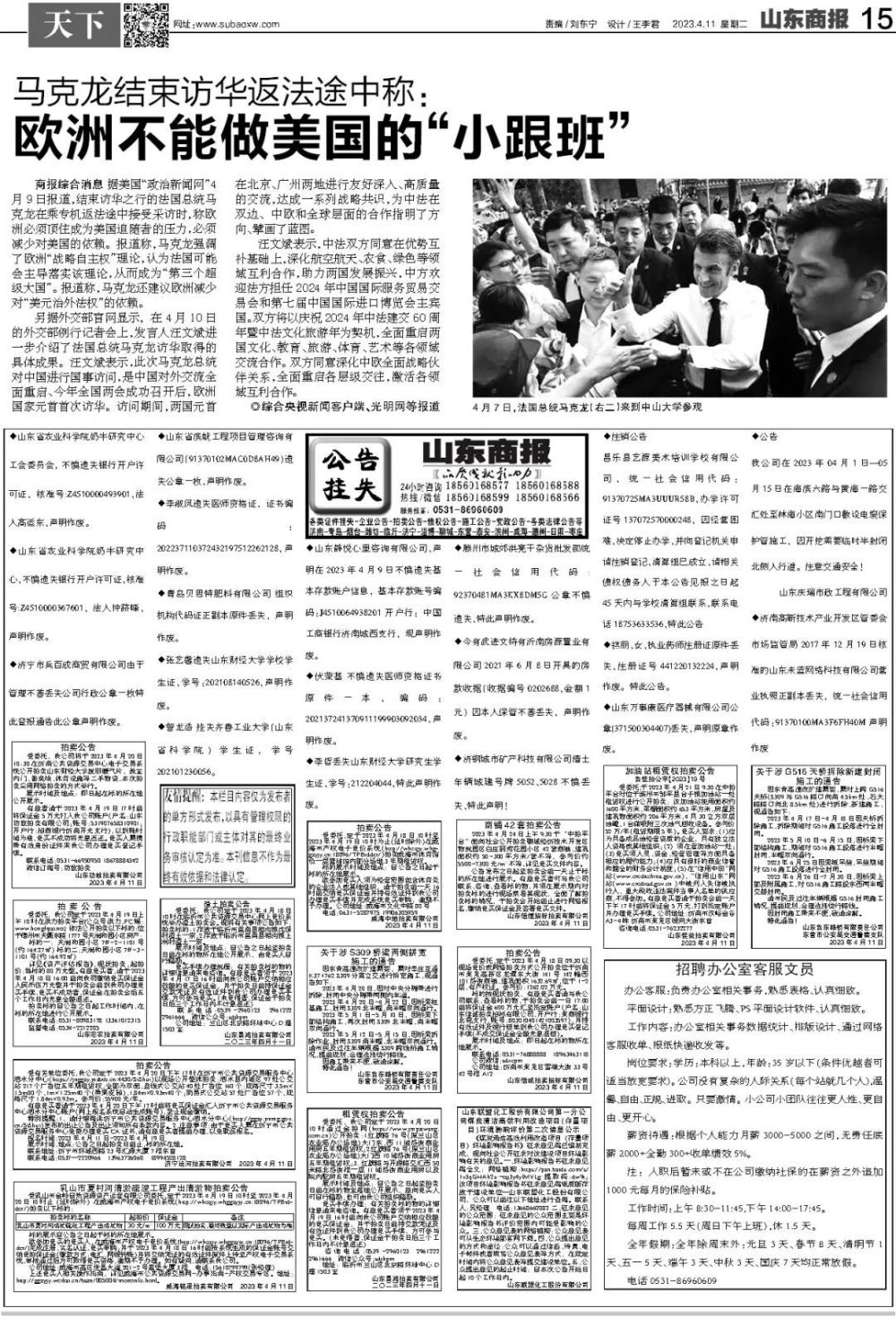 四期施工交通组织示意图 (2023年7月30日—2023年9月13日) 届时沿线将设置交通疏导标识,请过往车辆和行人留意现场交通标志,按照标志提示通行,并注意交通安全。请广大机动车、非机动车驾驶人以及行人积极配合,服从现场管理人员的指挥。施工期间,若现场通行条件发生变化,需对交通组织措施再作调整的,将另行发布公告。 特此公告。 济南轨道交通集团建设投资有限公司 2023年4月9日 山大、海大最新发布 4月10日,山东大学、中国海洋大学公布了2023年强基计划招生简章。山大报名时间为4月12日到30日,考生最多可报考3个专业志愿(第二类考生仅可报1个专业志愿),且不能兼报其他高校。详情: 山东大学重磅发布 海大报名时间为4月10日到30日,报考学校数量限定为1所,不可兼报其他高校。山大、海大强基计划主要招收两类学生,第一类是综合素质优秀、高考成绩优异的考生。第二类是相关学科领域具有突出才能和表现,高中阶段在五大学科竞赛中获得全国决赛二等奖及以上奖励的考生。(山东大学、中国海洋大学) 济南官方辟谣 近期,一些经营者向济南市平阴县市场监管局反映,他们接到“年报需收取费用”或“存在了经营异常需缴纳380元解除”的电话,有的已经交费。在此提醒,年报是免费的,如存在了经营异常情况需要到管辖所办理。只要涉及到交费肯定是诈骗电话,为避免上当受骗, 可在接到电话后向管辖所咨询相关事项。