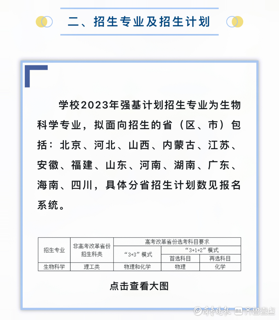 记者?高雅洁 4月10日,山东大学、中国海洋大学公布了2023年强基计划招生简章。山东大学强基计划招生专业包括8个专业,海大招生专业仅有1个。山大报名时间为4月12日到30日,海大报名时间为4月10日到30日,考生不可兼报其他高校。两所高校均实施“本硕博”衔接培养模式。 ![]() ![]() 山东大学、中国海洋大学强基计划主要招收两类学生,第一类是综合素质优秀、高考成绩优异的考生。第二类是相关学科领域具有突出才能和表现,高中阶段在五大学科竞赛中获得全国决赛二等奖及以上奖励的考生。 山东大学强基计划招生专业包括数学与应用数学、物理学、化学、生物科学、生物医学科学、汉语言文学(古文字学方向)、历史学、哲学等。中国海洋大学招生专业仅有生物科学。山大报名时间为4月12日到30日,考生最多可报考3个专业志愿(第二类考生仅可报1个专业志愿),且不能兼报其他高校。海大报名时间为4月10日到30日,报考学校数量限定为1所,不可兼报其他高校。 两所学校均要求考生确认是否参加学校考核。山大将于为7月3日前组织校考,包括笔试、面试和体质测试。海大校测时间拟定于7月4日,包括面试和体质测试两部分。 录取时,山大对于第一类考生,将根据考生入围专业和学校分省分专业招生计划,按综合成绩由高至低确定强基计划预录取名单。对于第二类考生,综合成绩达到所在省份第一类考生最低录取分数线的,予以录取并满足其专业志愿,所需计划不占已公布的各省强基计划名额。海大则是在学校考核合格基础上,对于第一类考生,将根据考生所在省份强基计划的招生名额,按综合成绩由高到低顺序确定强基计划预录取名单。对于第二类考生,综合成绩达到同省份第一类考生综合成绩最低录取分数线的,予以录取。 同时,两校还公布了培养方案。 山大强基计划按照“3+1+X”模式进行本硕博衔接培养,单独编班,单设培养方案。其中,“3”是指3年的本科培养阶段,包括通识教育、专业教育、实践环节等;“1”是指1年的本研衔接阶段,针对本学科领域以及国家重大战略需求(高端芯片与软件、智能科技、新材料、先进制造、国家安全、生物医学、国学、古典文献、考古学、马克思主义中国化、国家治理、国际问题等)设计对应的衔接课程模块,学生可选修其中一个模块;“X”是指研究生培养阶段,学生在选定的相关学科领域攻读博士学位,基本学制四年,符合博士学位授予要求的将授予博士学位。 海大实施“本硕博”衔接式的拔尖创新人才培养模式。前3年主要进行通识教育、学科教育和科研训练,达到学业标准的学生进入研究生阶段学习;中间2年,主要开展研究生专业教育和科学研究;后4年为博士培养阶段,在此期间含有1年国际合作培养经历。?? 新闻线索报料通道:应用市场下载“齐鲁壹点”APP,或搜索微信小程序“齐鲁壹点”,全省600位记者在线等你来报料! |